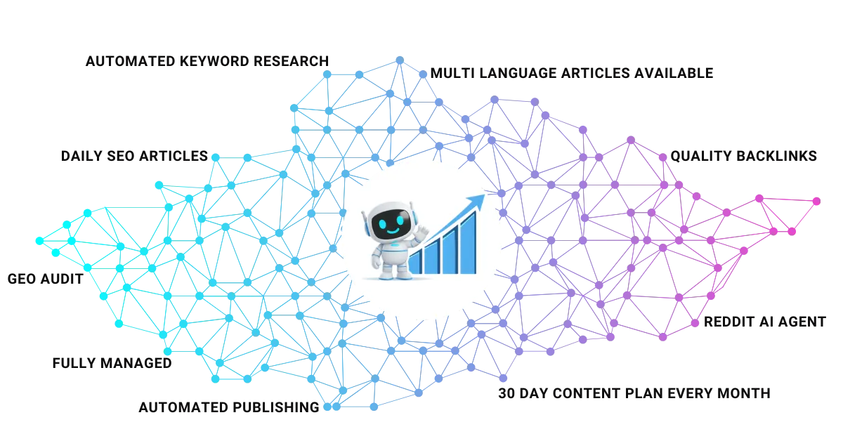 We build a tailored growth strategy using quality daily articles, automated backlinks, technical site optimisation, and AI-driven distribution to increase your visibility on Google and ChatGPT.